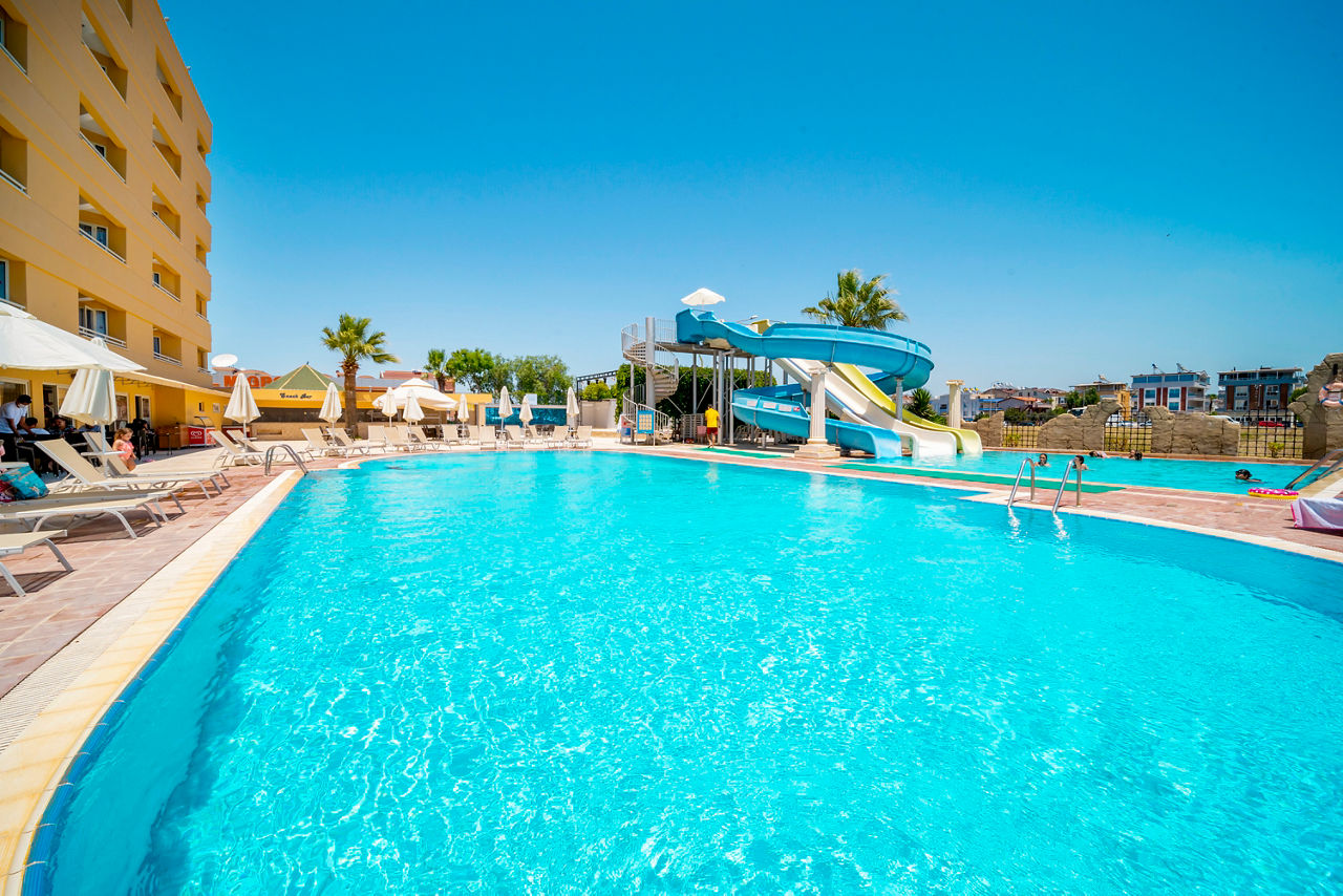 Away from all the hustle and bustle of Altinkum, Hotel Esra Family Suites is a Family Favourites property and then some. If being close to the beach, having a fab pool with waterslides and a choice of family suites sounds right up your street, you?ve just found your next holiday base. The fun doesn?t stop there ? a kids? club and playground will also be all yours here! Grown-ups will be delighted to know there?s a soothing spa with a Turkish bath, plus a programme of daily entertainment, buffet restaurant and three bars. Did we mention there?s All Inclusive as standard?Standard Double and Twin rooms sleep up to 3 adults or 2 adults and 1 child and have a bathroom with shower, hairdryer, air conditioning, satellite TV and balcony or terrace. Family suites sleeping up to 5 adults and Single rooms are also available.