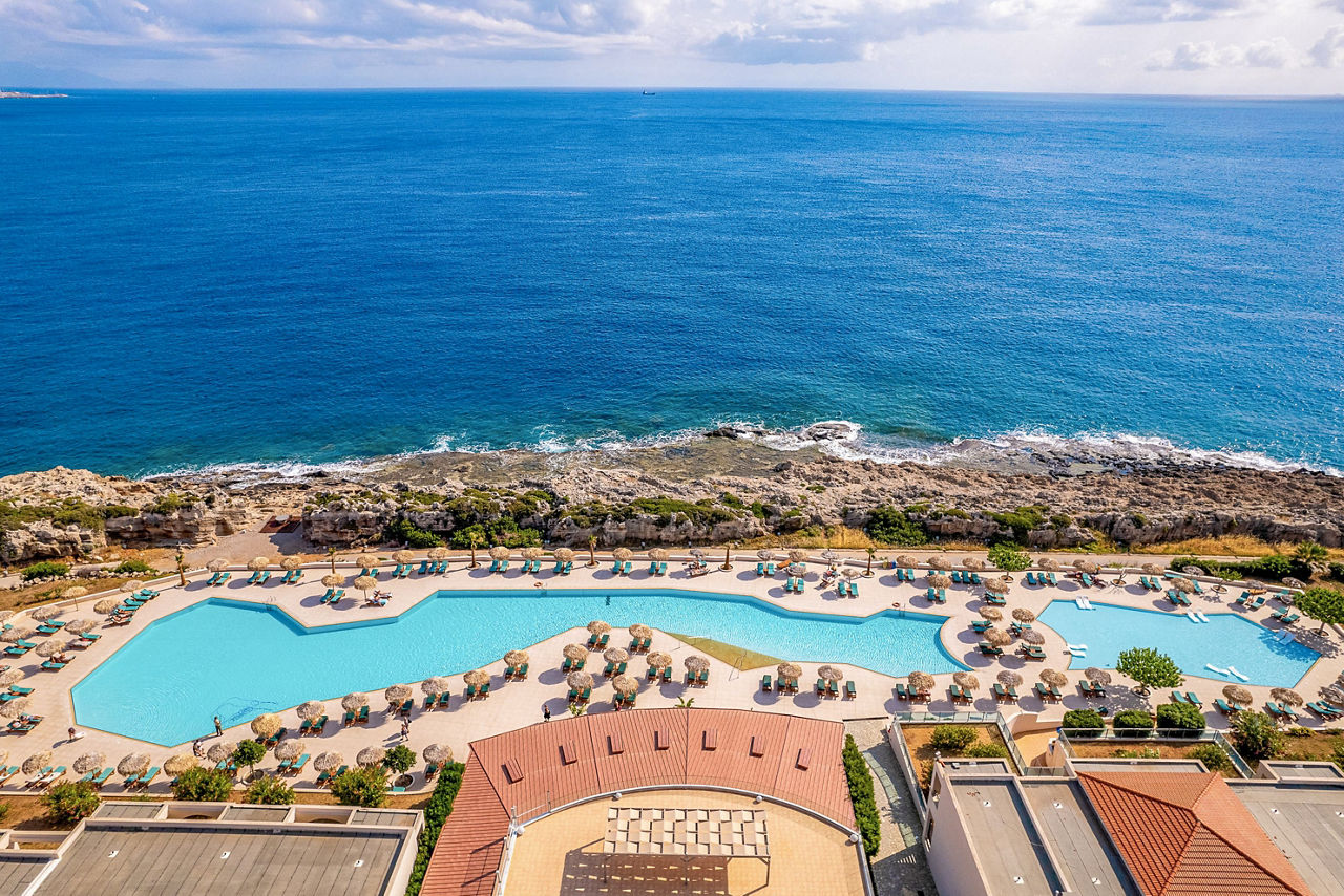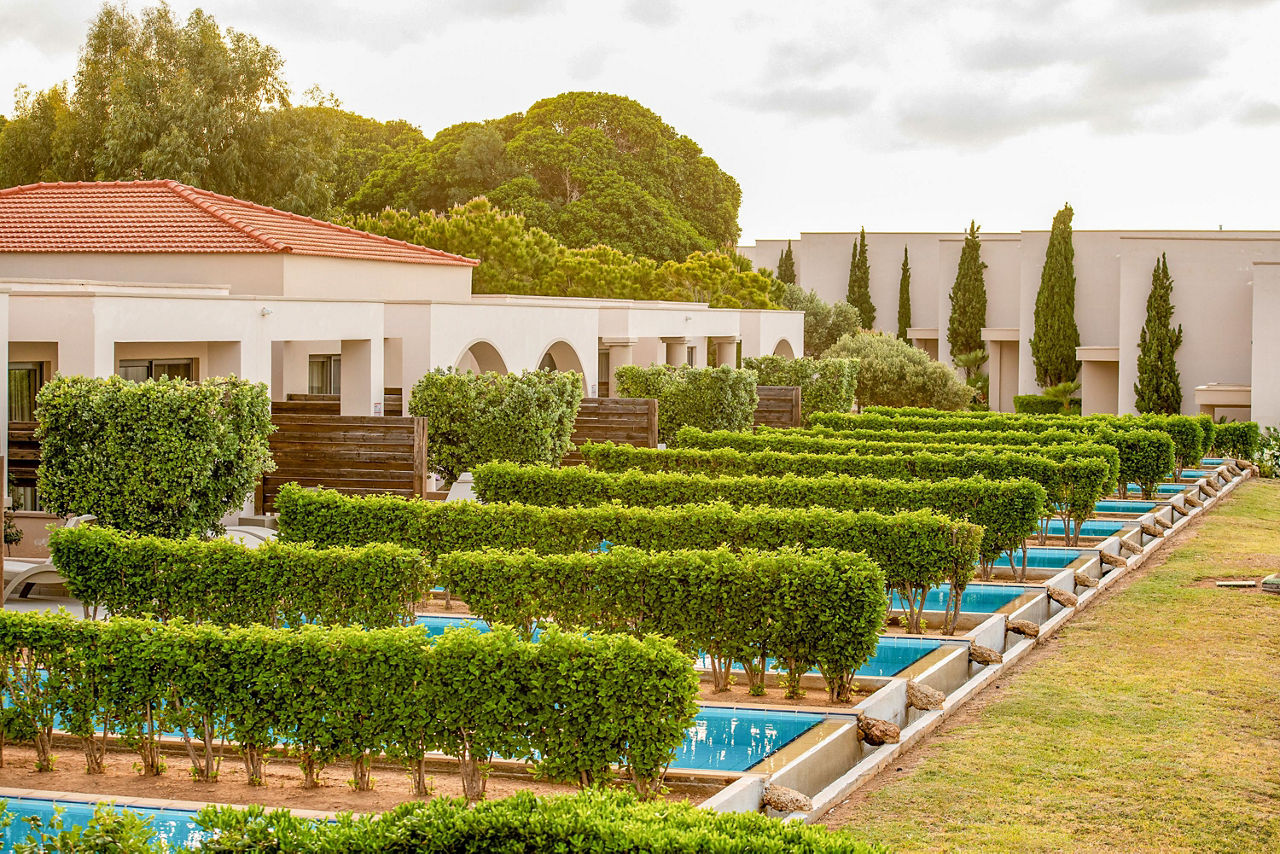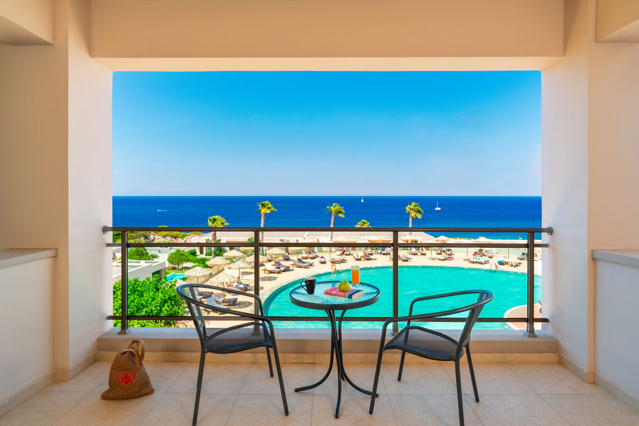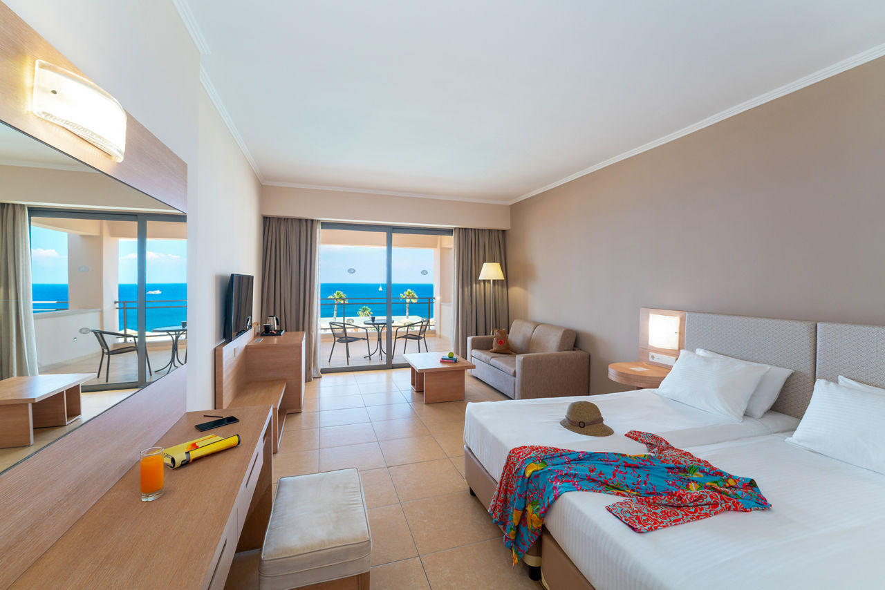 Double rooms with Garden View sleep up to 3 adults and have a bathroom containing a whirlpool bath, hairdryer, bathrobe and slippers, air conditioning (01 May-31 Oct), flat screen television, tea and coffee making facilities, fridge and balcony or terrace. Superior Double rooms with Sea View, Junior suites with Sea View sleeping up to 3 adults and 1 child, Villa Junior suite with Sea View and Private Pool sleeping up to 3 adults and 1 child, One Bedroom suites with Sea View sleeping up to 3 adults and 1 child, Royal Villa with Sea View and Private Pool sleeping up to 3 adults and 1 child and Single rooms with Sea View are also available.