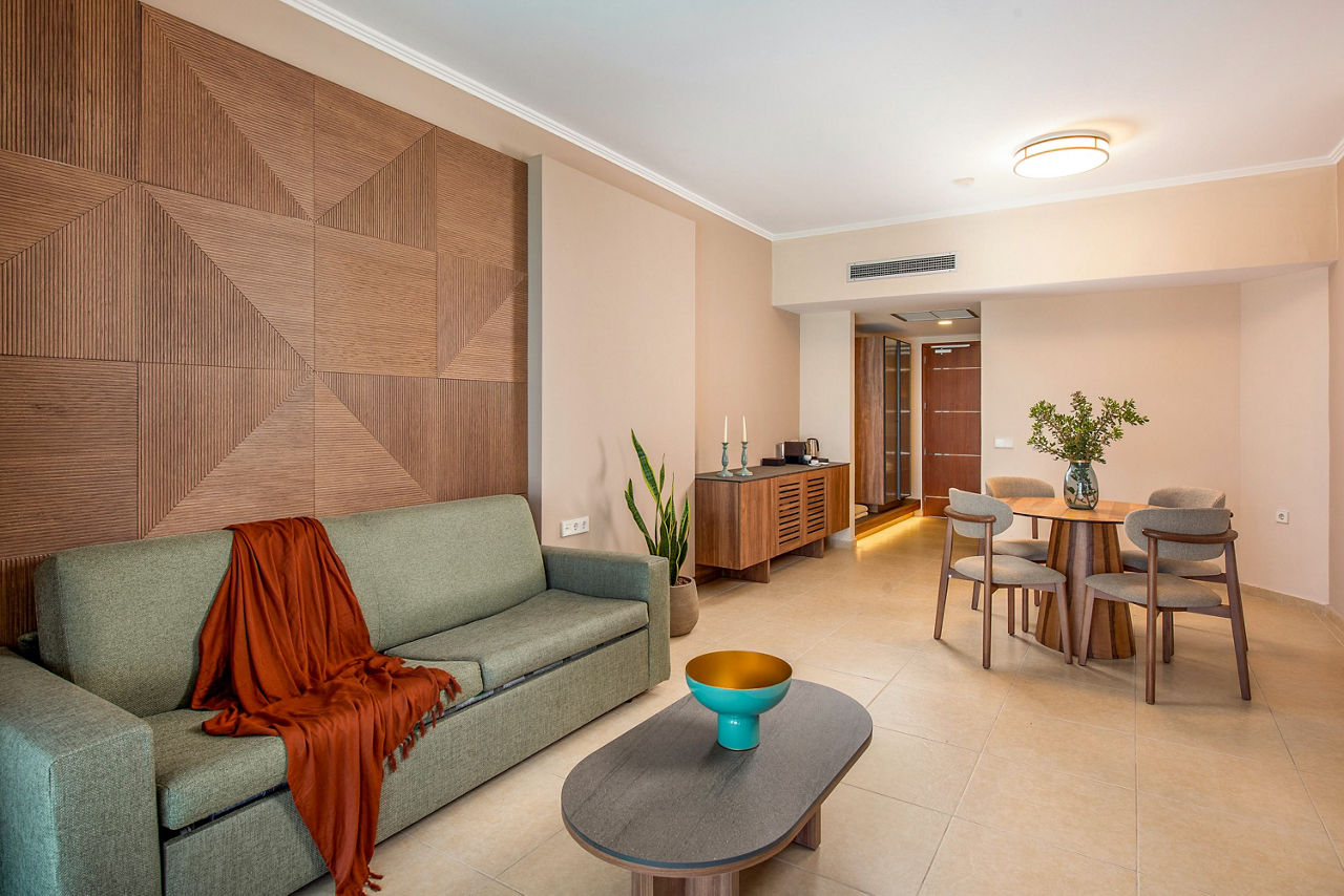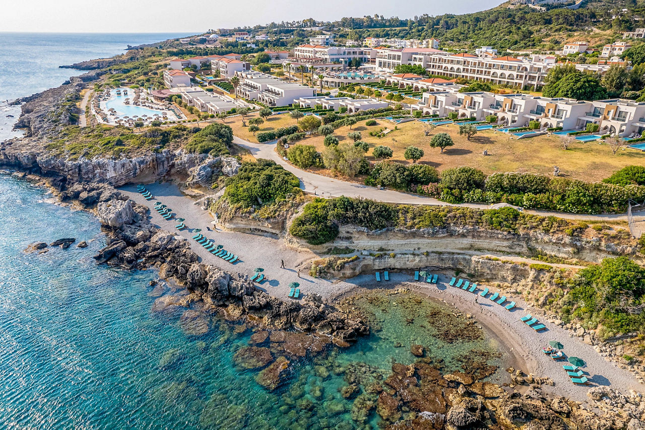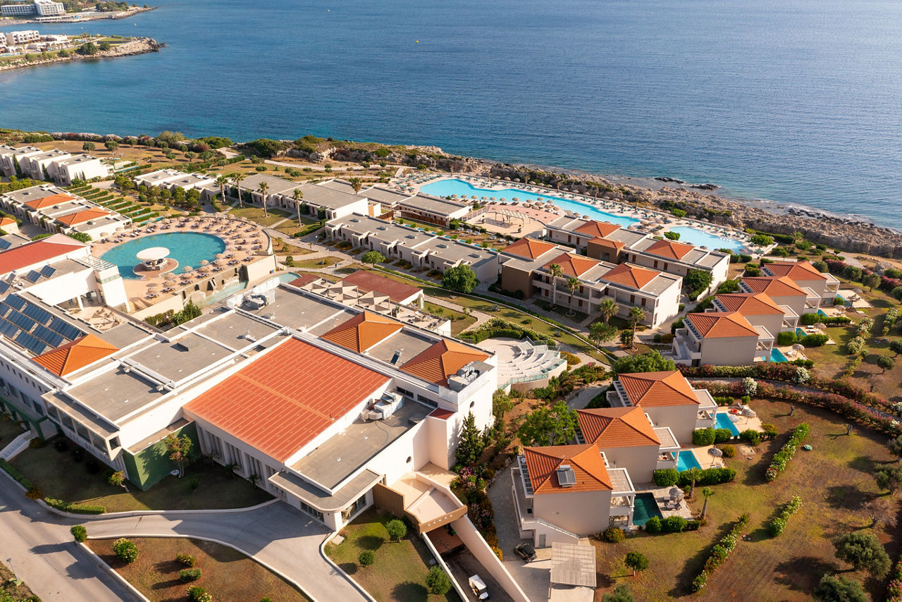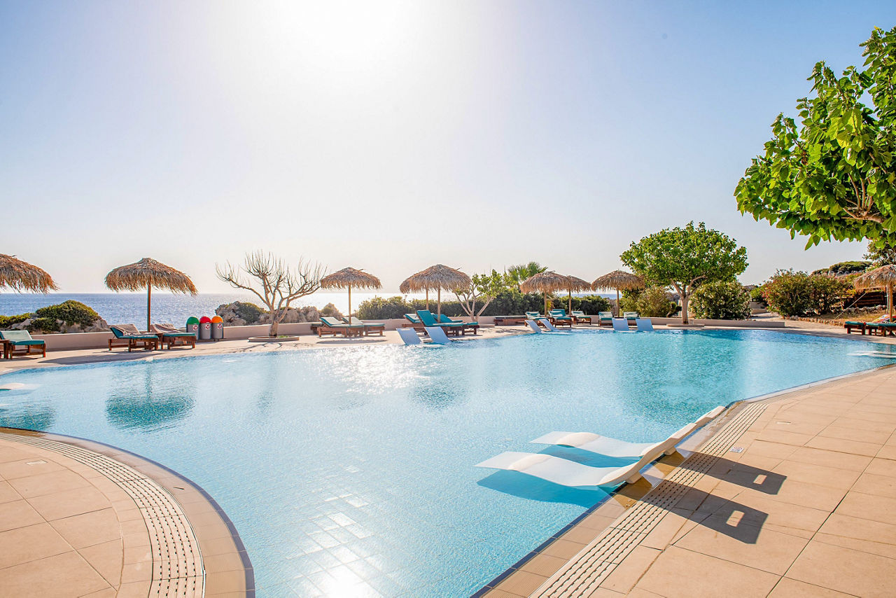 Double rooms with Garden View sleep up to 3 adults and have a bathroom containing a whirlpool bath, hairdryer, bathrobe and slippers, air conditioning (01 May-31 Oct), flat screen television, tea and coffee making facilities, fridge and balcony or terrace. Superior Double rooms with Sea View, Junior suites with Sea View sleeping up to 3 adults and 1 child, Villa Junior suite with Sea View and Private Pool sleeping up to 3 adults and 1 child, One Bedroom suites with Sea View sleeping up to 3 adults and 1 child, Royal Villa with Sea View and Private Pool sleeping up to 3 adults and 1 child and Single rooms with Sea View are also available.