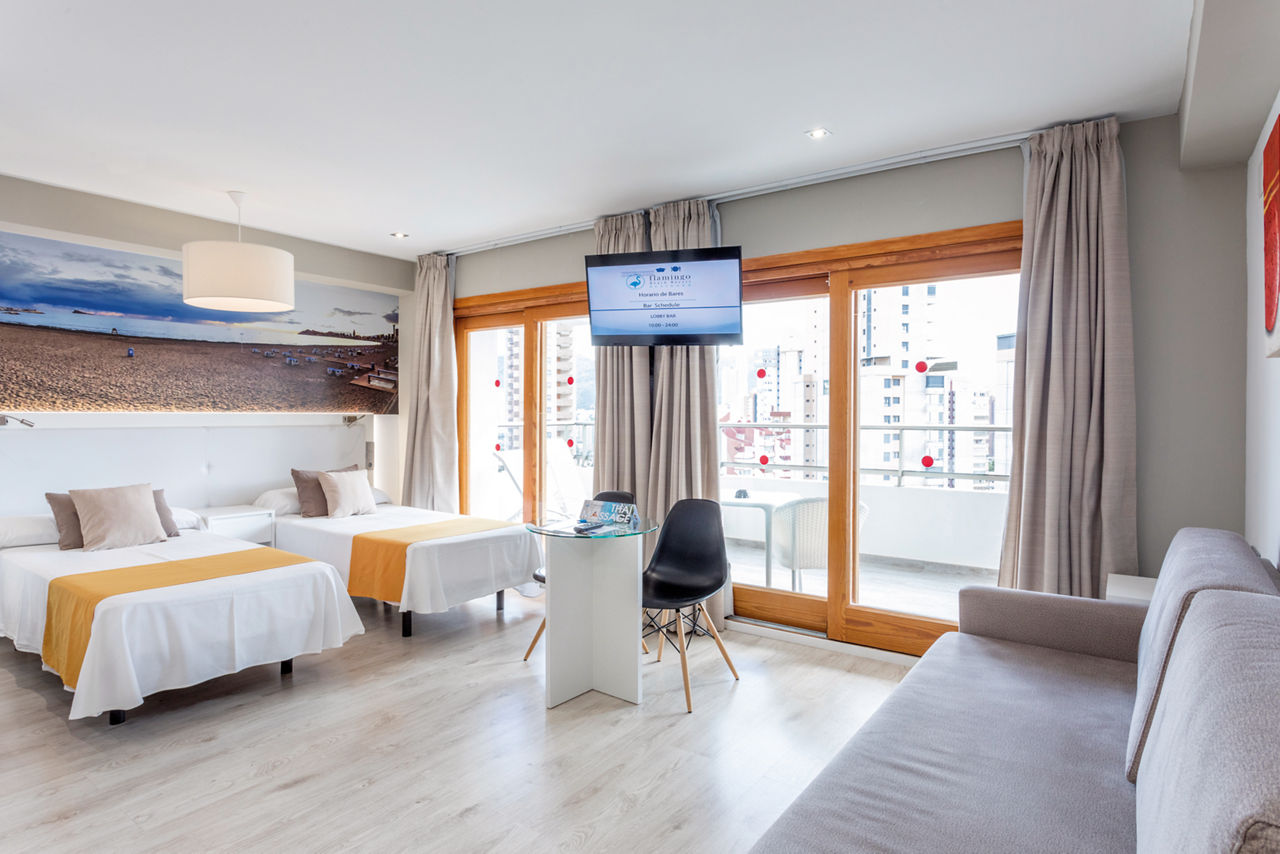 The Flamingo Beach Resort is a popular choice for adults in Benidorm. It has a clean, modern design and every room is a suite here, so you will enjoy the feeling of space and comfort. The hotel is set in a quieter area of Benidorm, yet you are still close enough to the action. With 3 pools to choose from, and a great all inclusive package, the Flamingo Beach Resort is the firm favourite in this classic resort.Junior suites sleep up to 3 adults and have a bathroom with bath, hairdryer, kitchenette, air conditioning*, flat screen TV, safety deposit box*and balcony or terrace. Junior suites for Sole Use are also available.