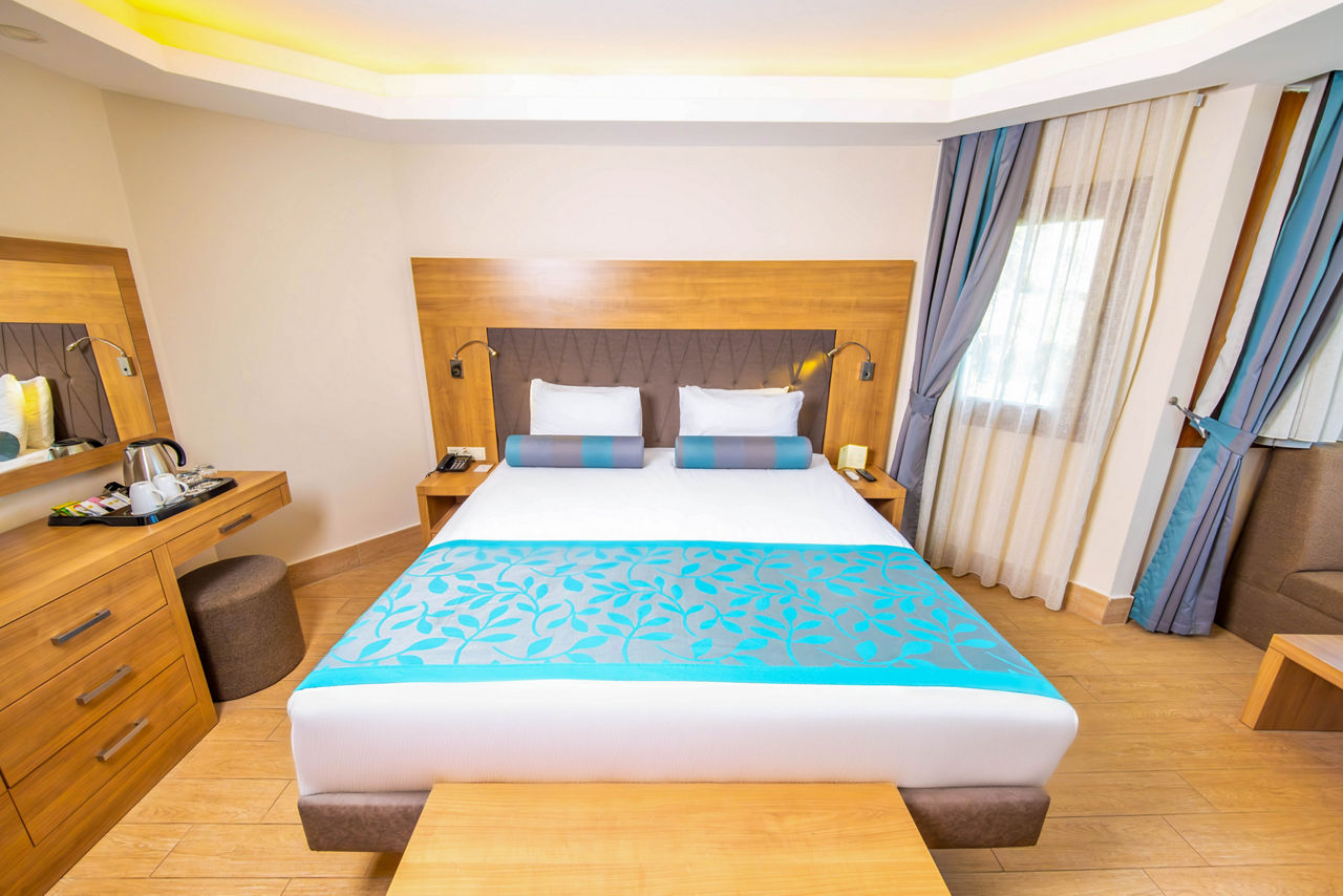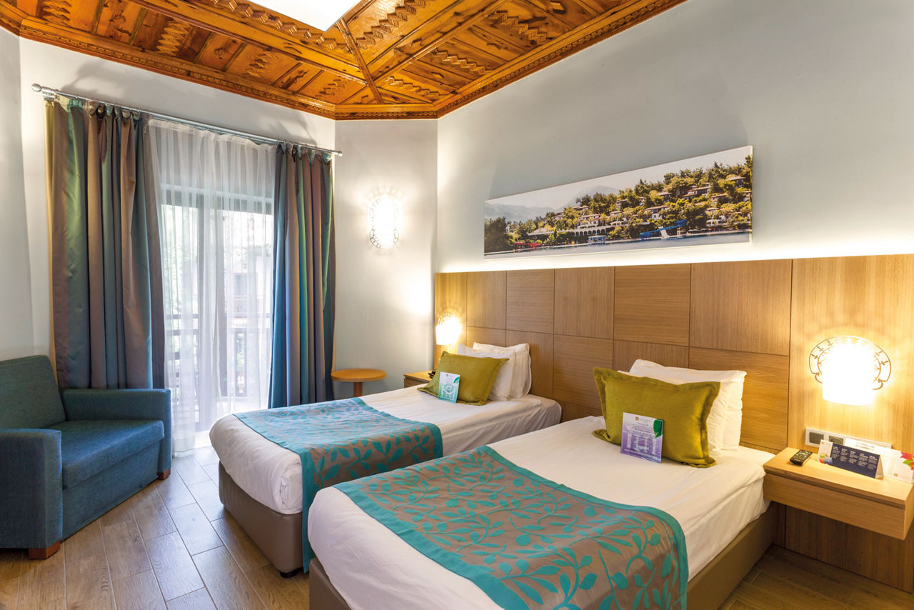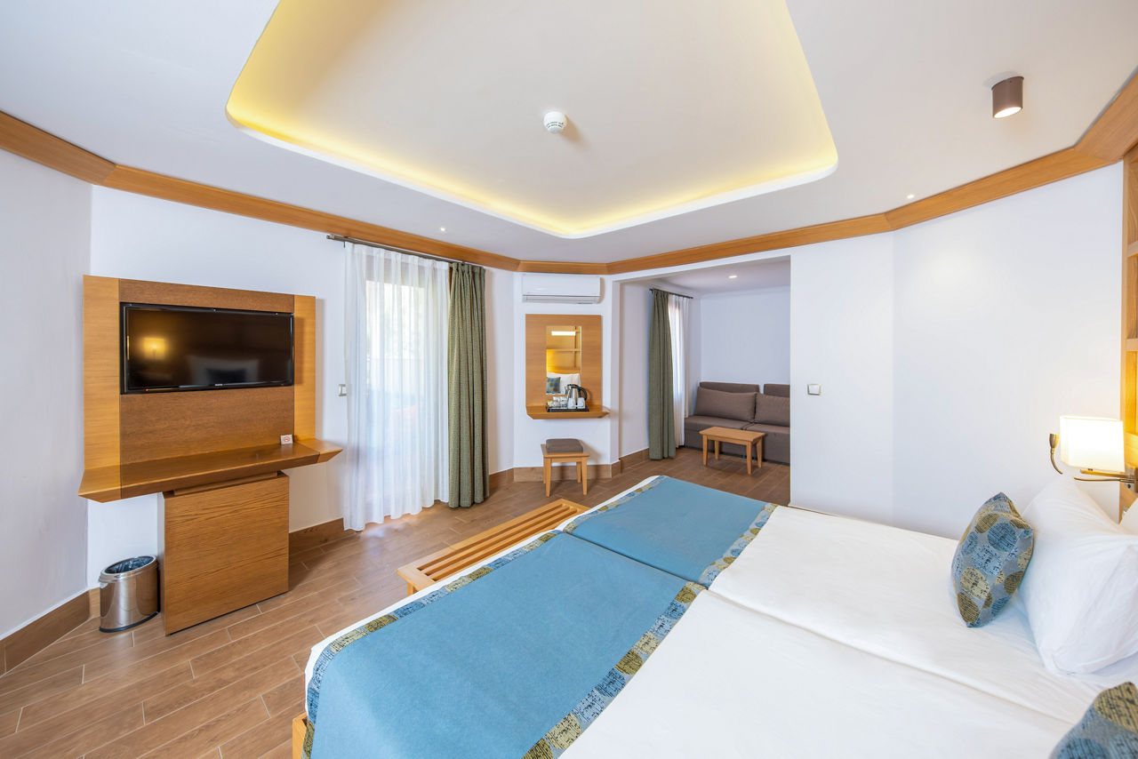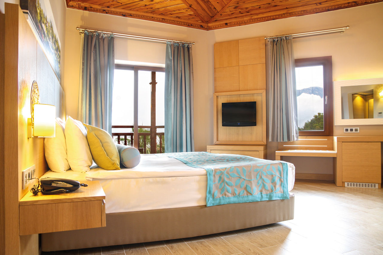 Located on a private peninsula, Letoonia ClubBungalow rooms are located on the hillside in clusters spread throughout the grounds and sleep up to 2 adults and 1 child (double or twin beds and fold away beds), bathroom with shower, air conditioning, kettle, satellite TV, hairdryer, bathrobes, slippers and a bay window, balcony or terrace. Hotel rooms with balcony or terrace, Hotel rooms for Sole use are located in the main building and Bungalow rooms for Sole use are also available. Many of the rooms are accessed by steps.
