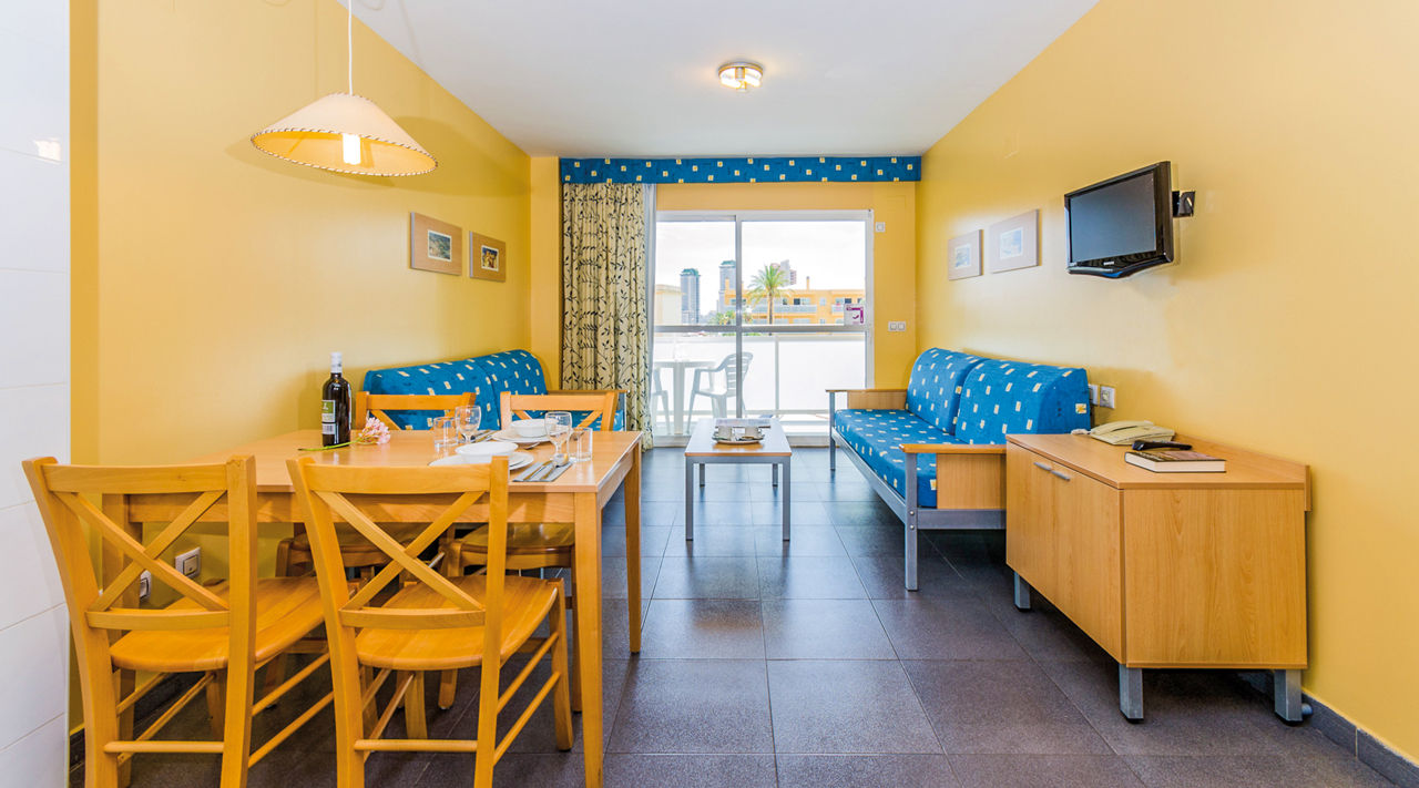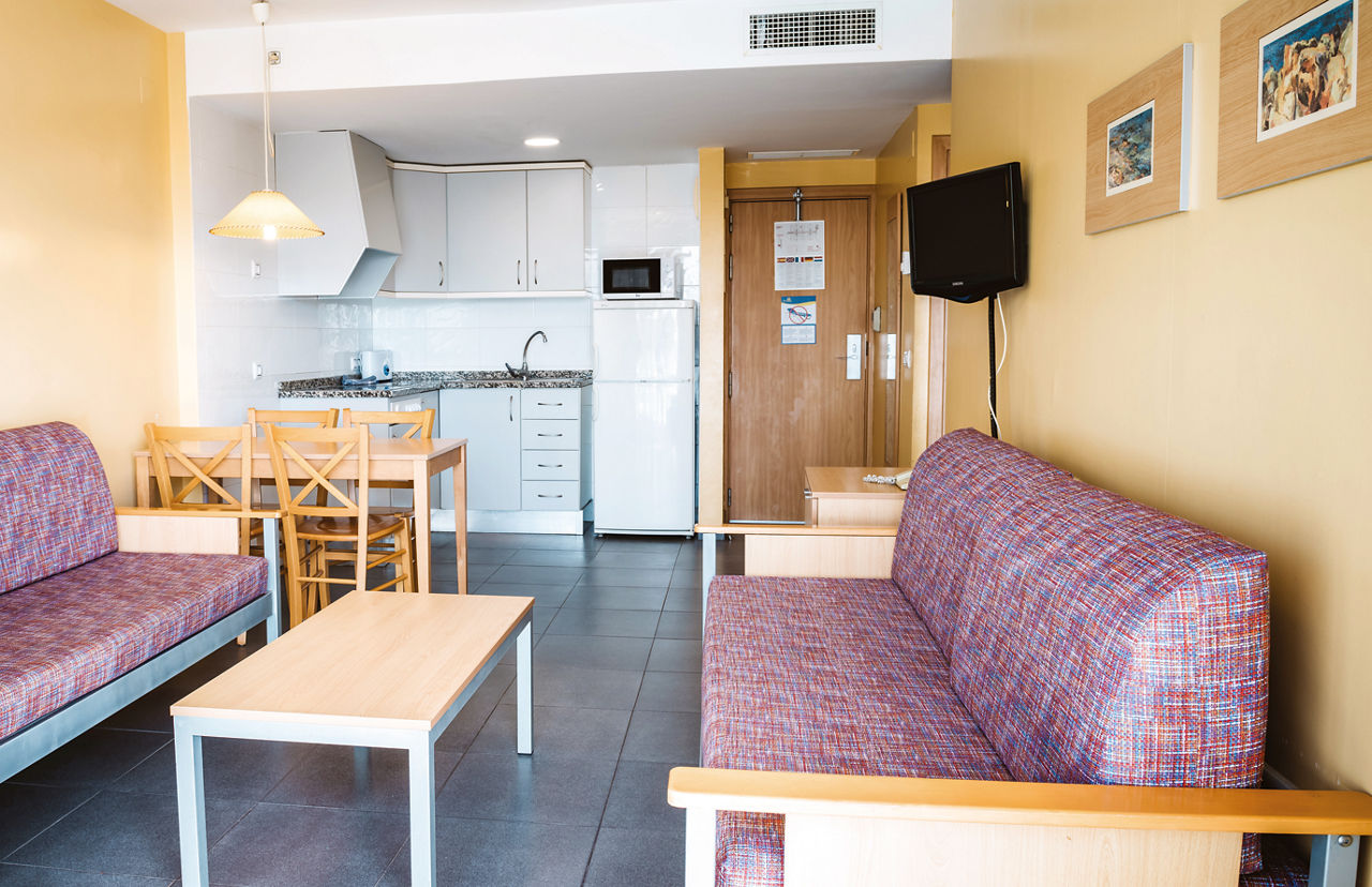 Offering you space and comfort in your own home from home, Aparthotel Terralta lays on the lot for families. Think a relaxed retreat, kids' splash pool with slides and a buffet restaurant for when you don?t fancy donning your chef?s whites. Located on the outskirts of Benidorm, you?ll have the best of both worlds. Tick off the resort?s attractions, then retreat to these quaint apartments and relish the peaceful postcode. Fancy exploring the local area? Make the most of the hotel?s bike hire and enjoy some sightseeing from the saddle.One Bedroom apartments sleep up to 4 adults and have a bathroom with shower, air conditioning, satellite TV, kitchenette with cooking rings, microwave, fridge, kettle and toaster, 2 sofa beds in the lounge area and a balcony. Two Bedroom apartments sleeping up to 6 adults and Pool View apartments are also available. Please note: Cots are payable locally at ?5 per day.