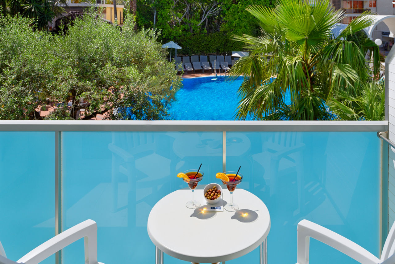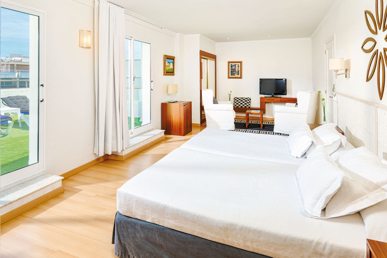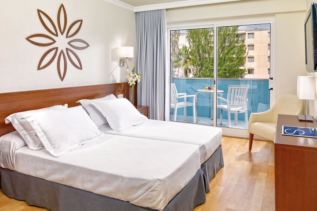 Twin rooms sleep up to 3 adults and have a full bathroom, hairdryer, air conditioning, satellite TV and a balcony or terrace. Twin rooms with Pool View and Single rooms are also available.