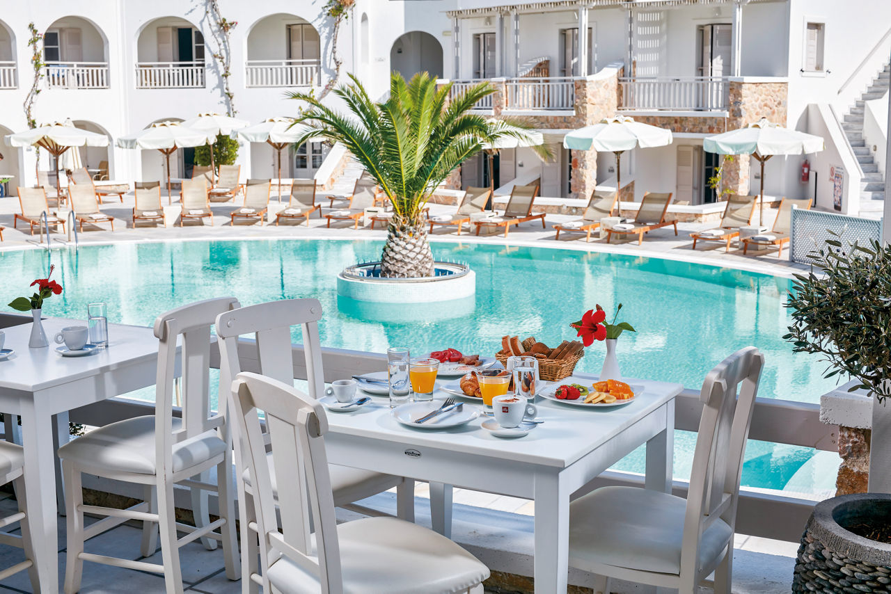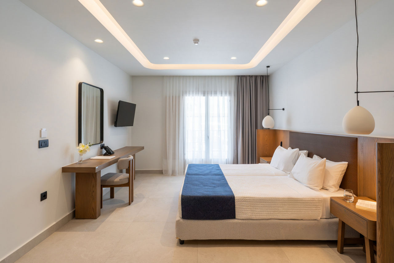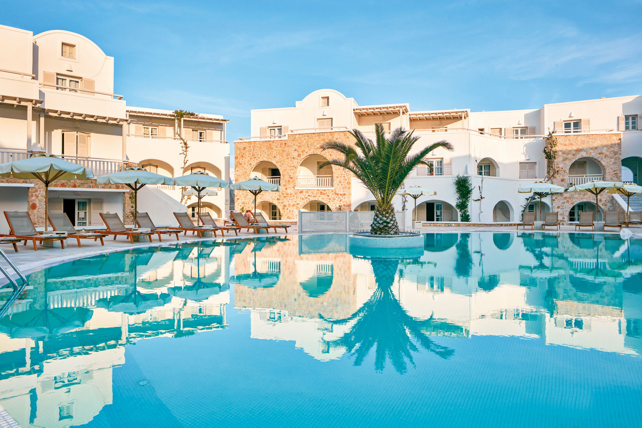 For a perfectly located break in Kamari, look no further than the Aegean Plaza Hotel. With the resort centre and charcoal-coloured shores of Kamari on your doorstep, you couldn't ask for a better base. Make the most of your stay by exploring more of the serene island of Santorini too, with Perissa just a short car ride away. Take your pick from three pool areas to lounge by for some well-deserved R&R. Who's up for catching some rays on the comfy sunbeds? Enjoy breakfast on the terrace before starting your adventures. Save some time to tick off the capital and iconic spots like the Three Bells of Fira.Double rooms sleep up to 2 adults and 1 child and have bathroom, air conditioning, hairdryer, flat screen television, fridge and balcony. Suites sleeping up to 2 adults and 2 children are also available.