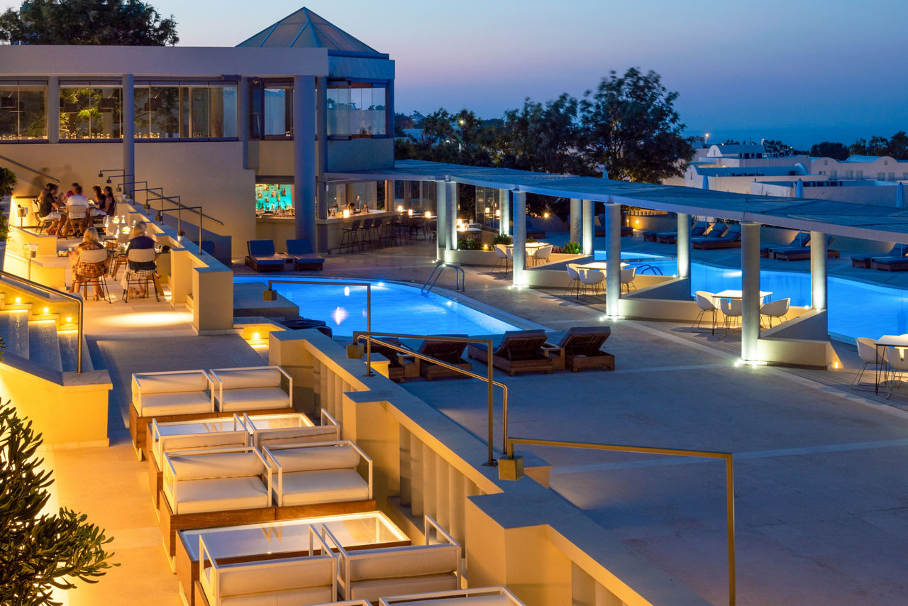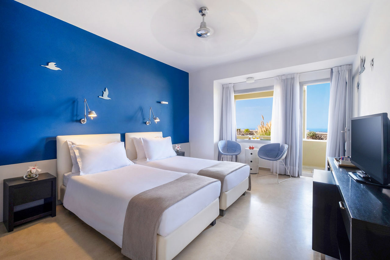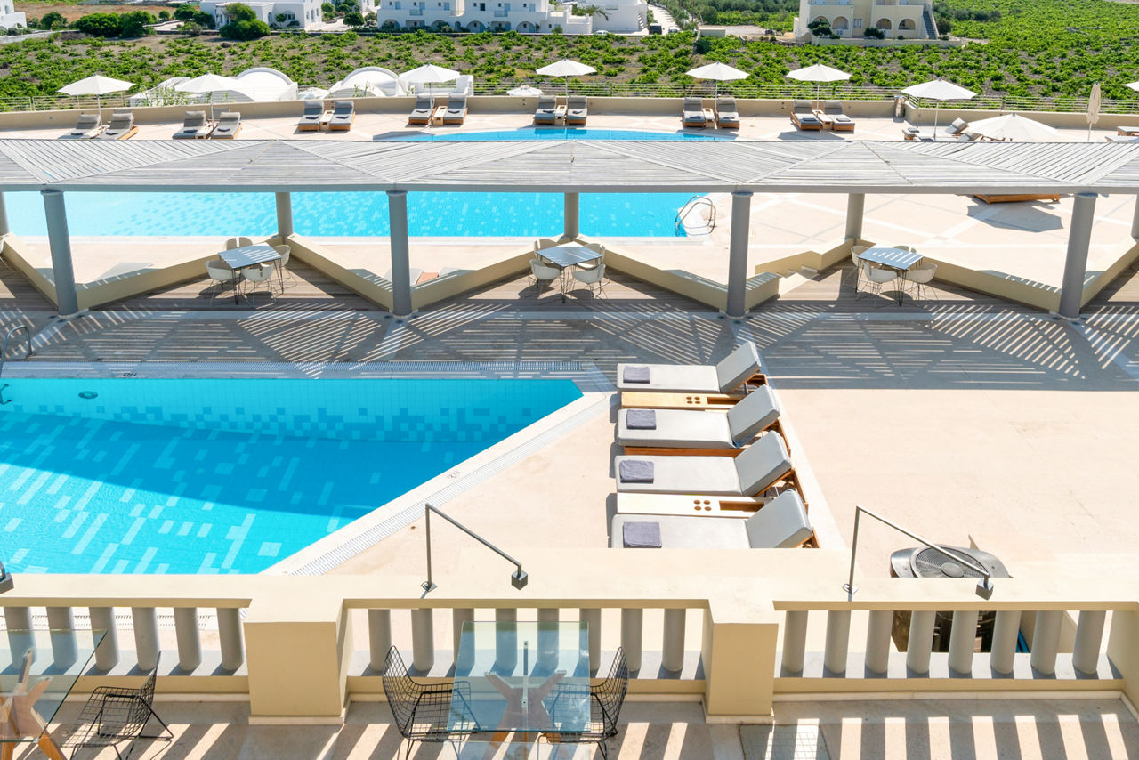 Sitting pretty on the hilltop spot overlooking Santorini's iconic Caldera, you will find the Majestic Hotel. Prepare to be stunned by the far-reaching views over the glistening Aegean Sea and the wow-factor really starts to crank up as blues fade to orange when the sun begins to set. You definitely can't miss sitting back and sipping on a cocktail from the hotel bar as night begins to fall. By day, make the most of the pretty pool area, or if you fancy a spot of exploring, Fira, the island's capital with whitewashed houses and blue-domed churches, is just a short walk away. There's a variety of room types to choose from too, why not upgrade to a sea view or a volcano view for picture-perfect views from the moment you wake up? Or perhaps you want more space? Choose a Master suite or a Maisonette. Whatever room you stay in, you'll feel right at home!